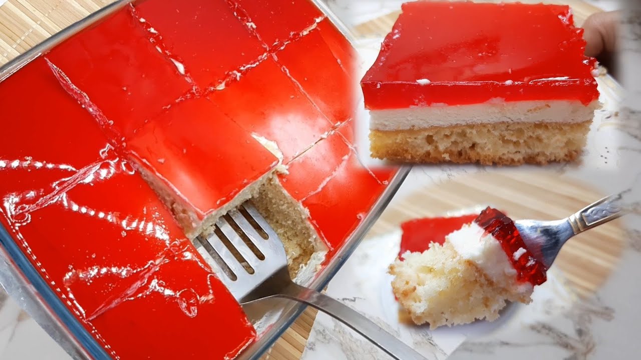 - ضعي الكيكة في الثلاجة لمدة 3-4 ساعات أو حتى يتماسك الجيلي تماماً.