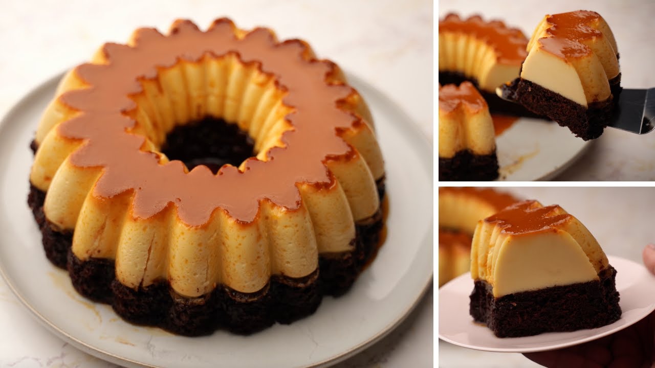 - يسكب الكراميل فورًا في قالب كيك بقطر 25 سم، ويفضل أن يكون القالب مجوف من المنتصف.