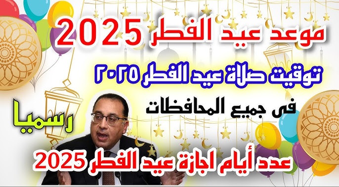 أعلن رئيس الوزراء الدكتور مدبولي عن الموعد المحدد إجازة عيد الفطر 2025 والتي من المقرر أن تبدأ يوم السبت القادم الموافق 29 من مارس وتنتهي في يوم الثلاثاء الموافق 1 أبريل على أن تعود المصالح الحكومية والمدارس والجامعات للعمل بدءا من يوم الأربعاء الموافق 2 من أبريل 2025.